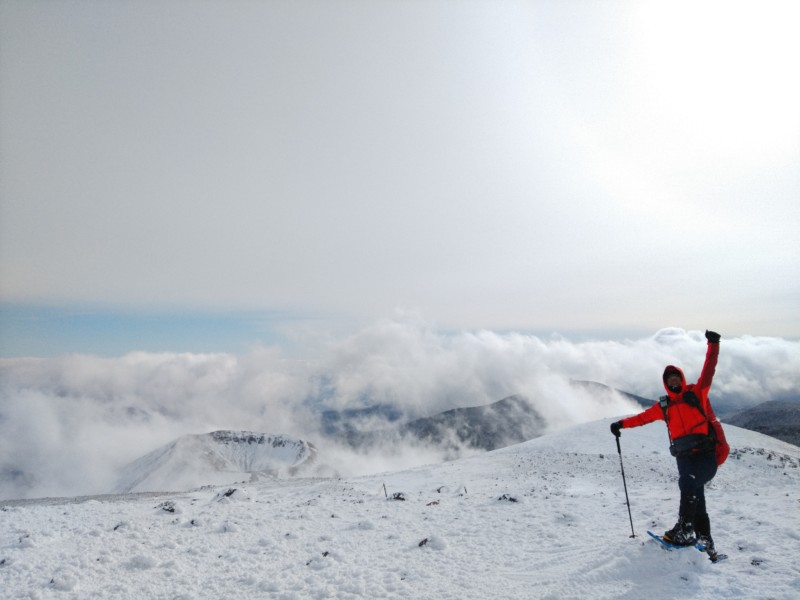 そして、出発から3時間で、夏場コバルトブルーに輝き、「魔女の瞳」とも呼ばれる五色沼の外輪山の上へと到着した。